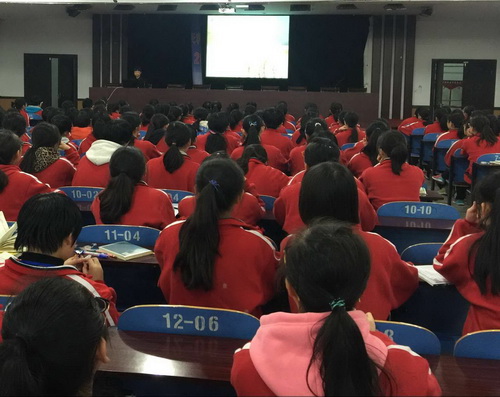 11月23日、24日晚,我校高一、初三年级女生分别在明德楼七楼会展中心认真聆听了葛延峰副教授《破蛹成蝶  花季绽放》的专题讲座。